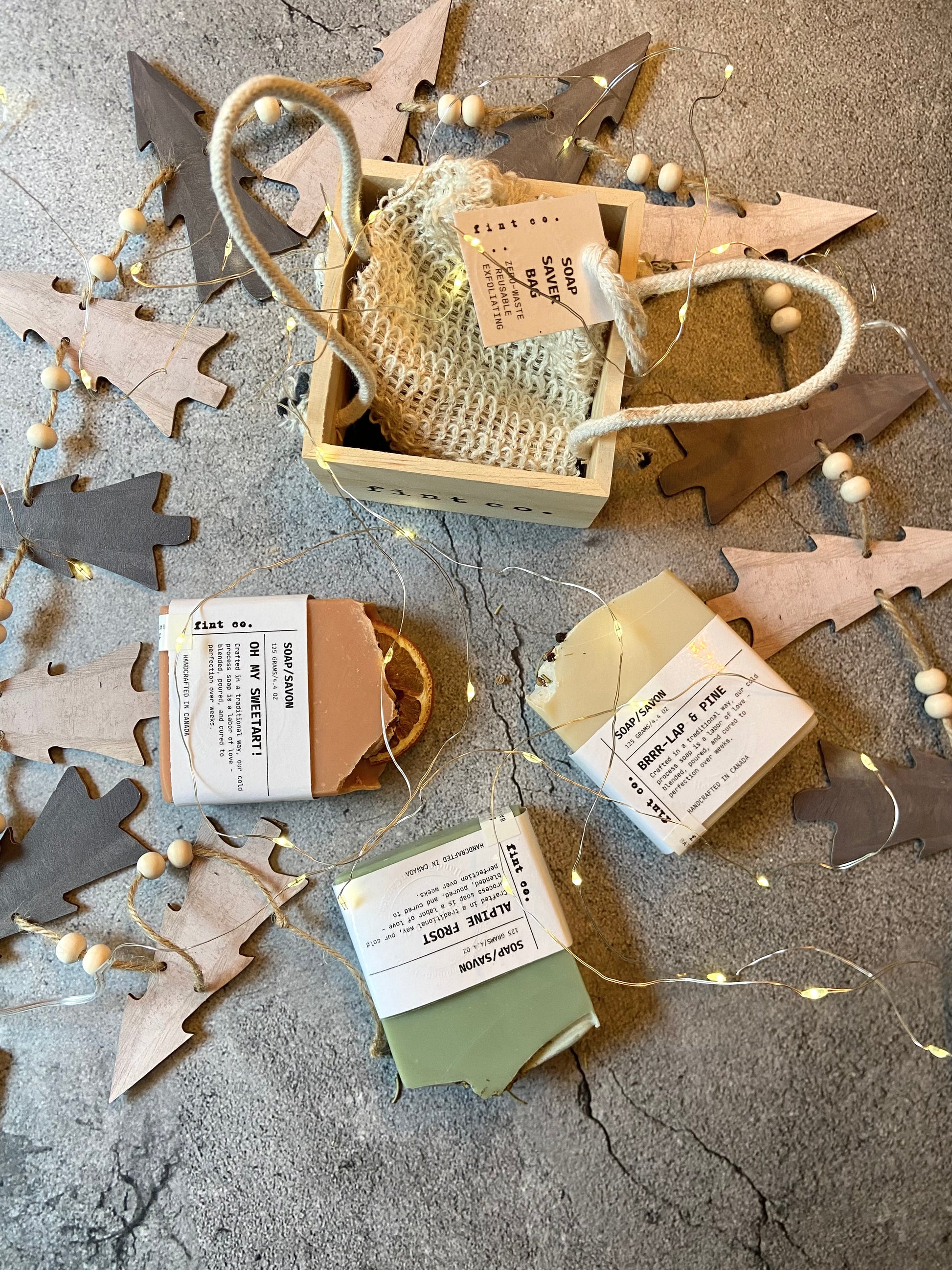 Our Soap Gift Set includes three beautifully scented soap bars, one eco-friendly soap saver bag, and one handcrafted wooden soap dish. Each soap is made with high-quality ingredients to gently cleanse and nourish your skin, making this set a perfect gift for yourself or someone special.